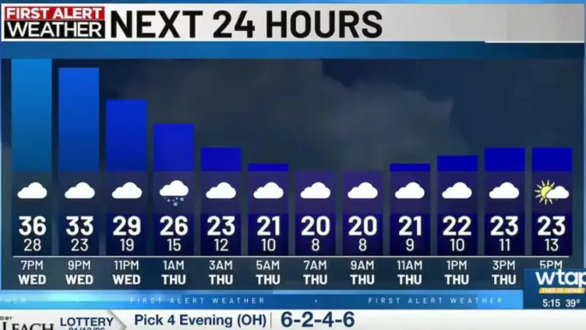 A significant drop in temperature is expected to affect the Mid-Ohio Valley tonight as a wave of Arctic air brings snow showers. The arrival of these snowflakes is projected between 6 p.m. and 8 p.m. local time.