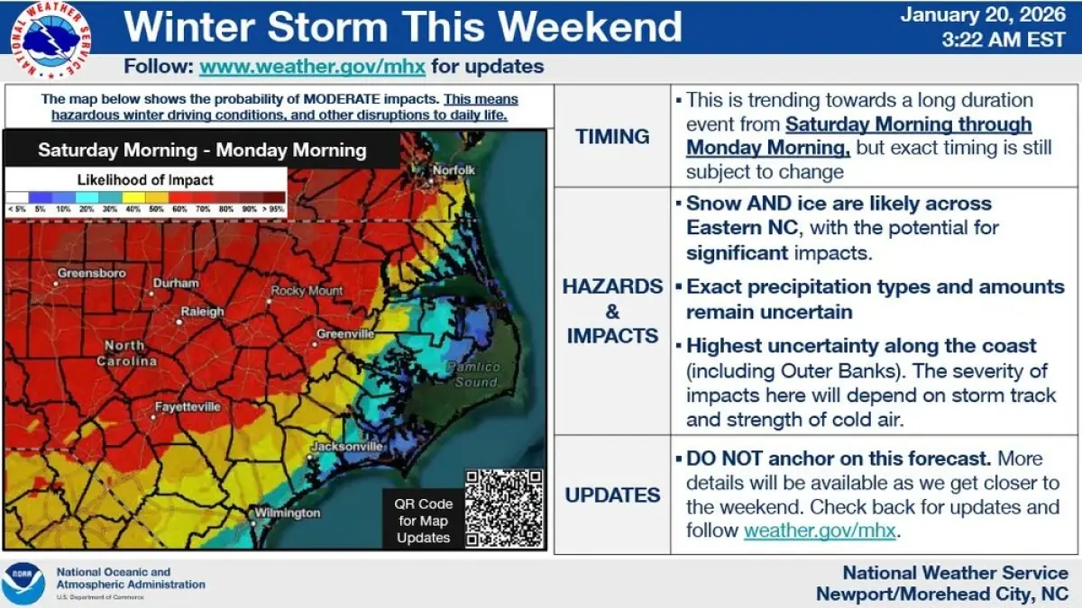 Friday night into Saturday (Jan. 24): Higher confidence for disruptive icing and/or accumulating snow across parts of the Southeast and southern Appalachians as colder air deepens.