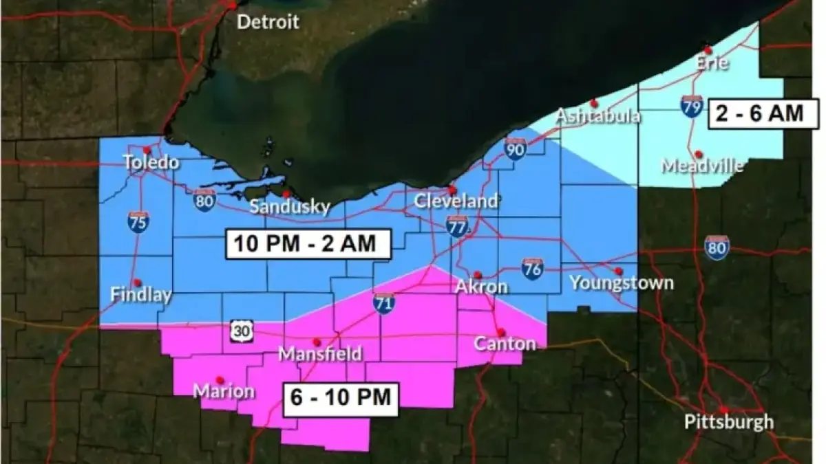 - 2 to 6 a.m. Sunday: Ashtabula County and northeastern segments of Lake and Geauga counties are expected to see snow, while southwestern Ashtabula County may receive snow earlier.