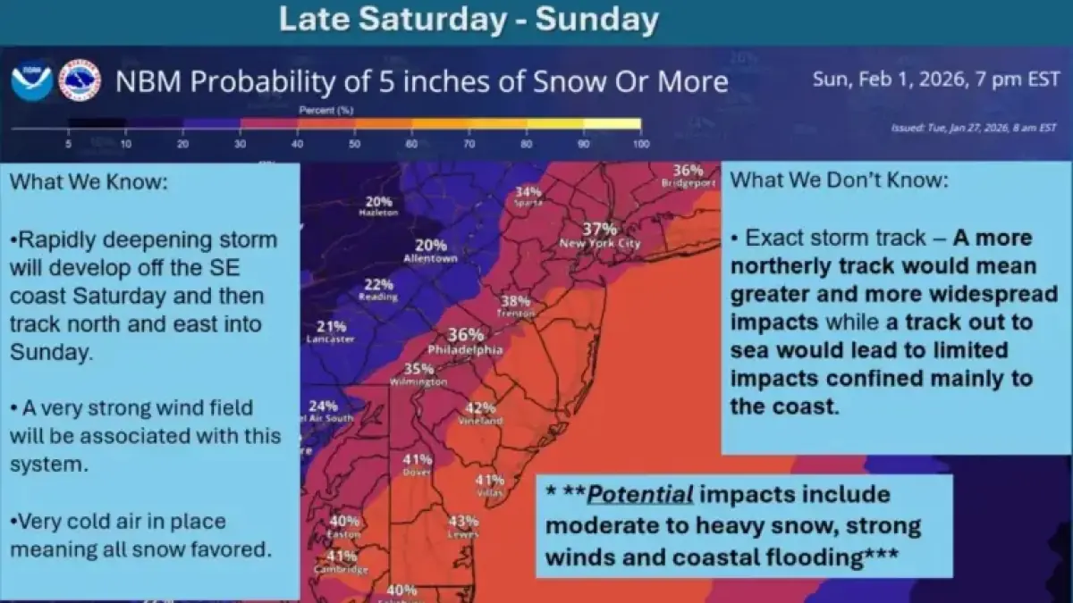 New Jersey residents should prepare for a potential winter storm this weekend, with snow forecasted late Saturday into Sunday. The National Weather Service has identified an increased likelihood of impactful snow and wind along the East Coast. However, uncertainty remains regarding the storm’s specific track.