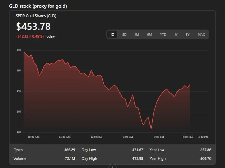 | GLD (SPDR Gold Shares) | $454.79 (intraday $431.67–$472.98) | 2:57 p.m. |