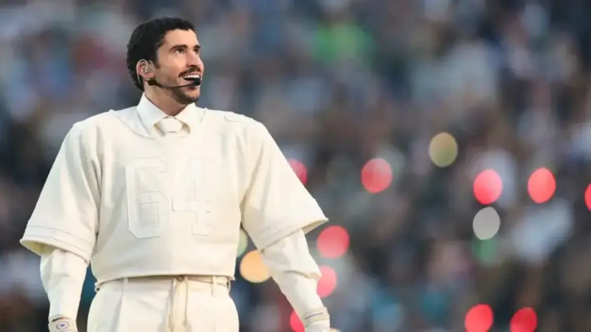 Bad Bunny made headlines during the Super Bowl halftime show, not just for his performance, but for his striking outfit. His ensemble featured a cream-colored wide-leg pant set from Zara, highlighted by a shoulder-pad football jersey that bore his surname, Ocasio, and the significant number 64.
