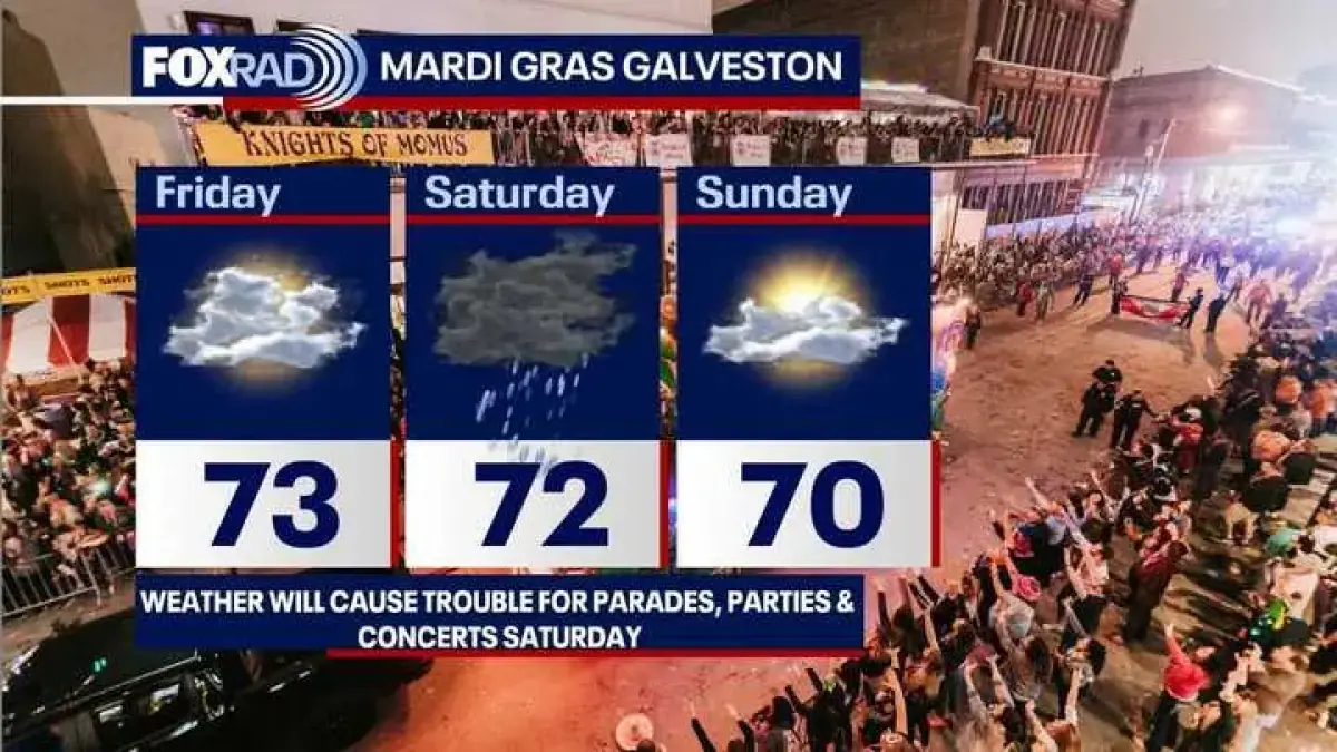 Residents can expect rain throughout Saturday morning and afternoon, affecting various festivities, including Valentine’s Day plans and Mardi Gras celebrations in Galveston. The chance for storms will significantly increase in the evening hours.