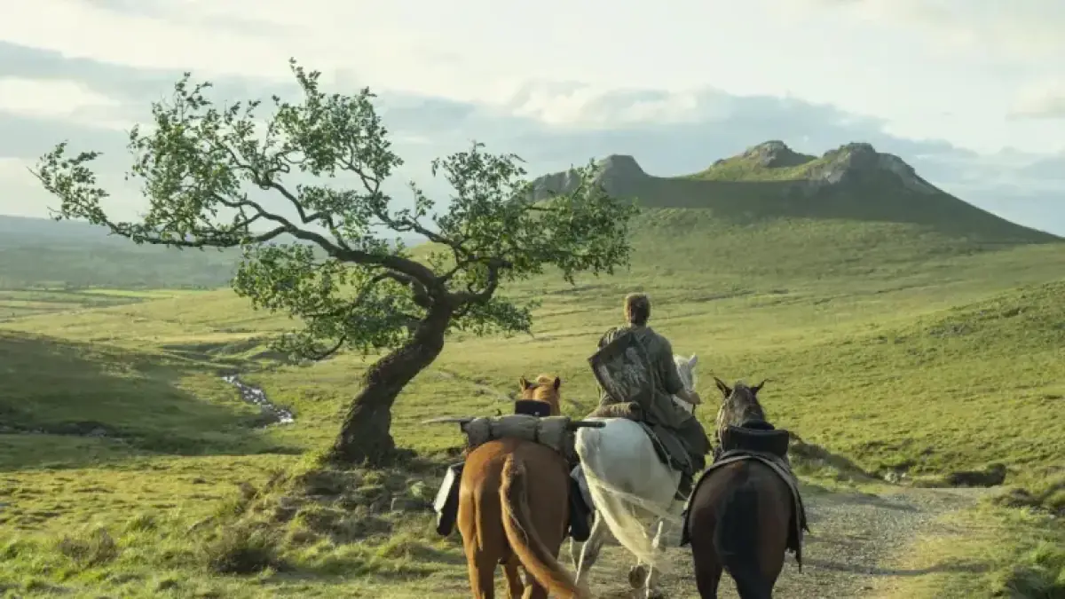 The opening scene of A Knight of the Seven Kingdoms sets an impressive tone. It features three horses standing in the rain, perfectly framed against a grassy hill and a muddy track. One horse faces the camera directly, while the others are angled artistically. This composition resembles a finely crafted painting.