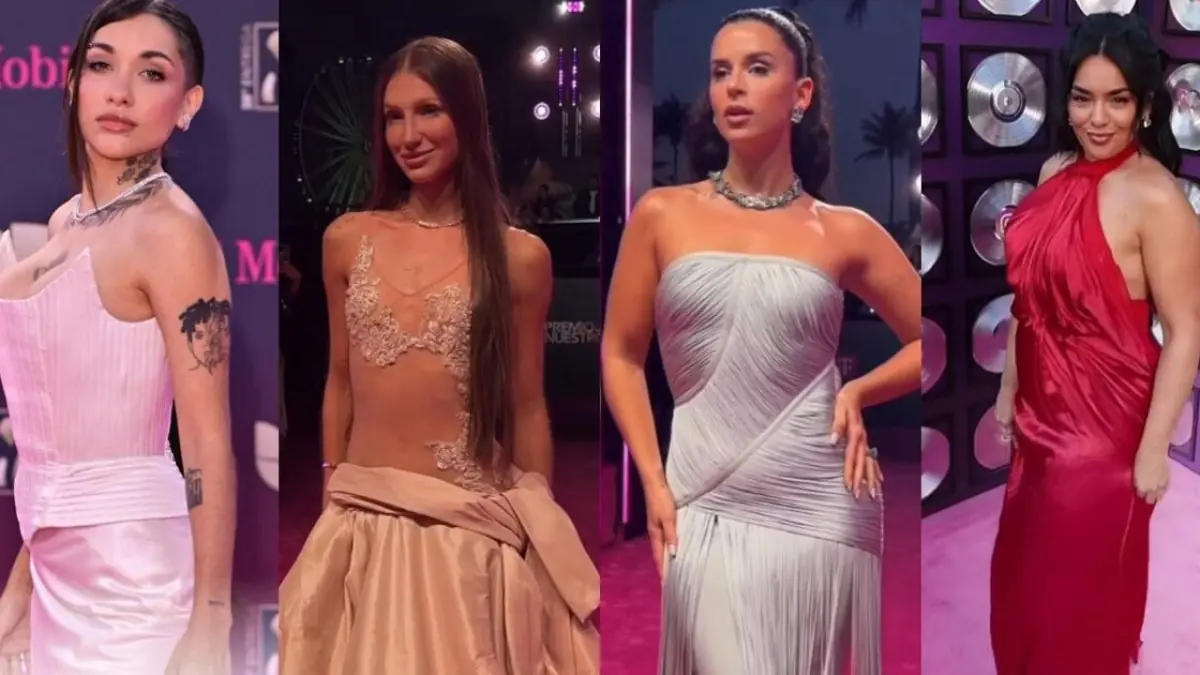 Coverage of the awards night includes two distinct descriptions of Maria Becerra’s red‑carpet fashion. One account describes her in a pale pink, structured gown with a corset and satin skirt, styled with a wet side‑part and minimal jewelry, the artist’s visible tattoos noted as part of the look’s urban edge. Another description depicts her in a silver ensemble: a satin corset with a pronounced neckline and crossed ribbon detailing at the back, paired with a straight satin skirt and side‑parted dark hair tucked behind the ear, with tattoos visible on the neck, clavicle and left arm.