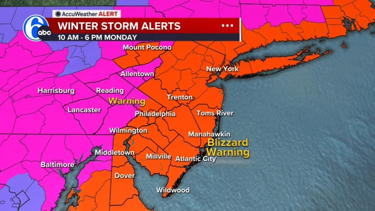 A Blizzard Warning has been issued for Philadelphia, several suburban Pa. counties, along with the entirety of New Jersey and Delaware. The warning goes into effect Sunday for most of the viewing area and is tied to sustained wind and snowfall conditions that meet the formal blizzard definition: three or more hours of winds gusting to 35 miles an hour or greater, falling or blowing snow, and visibility less than a 1/4 of a mile.