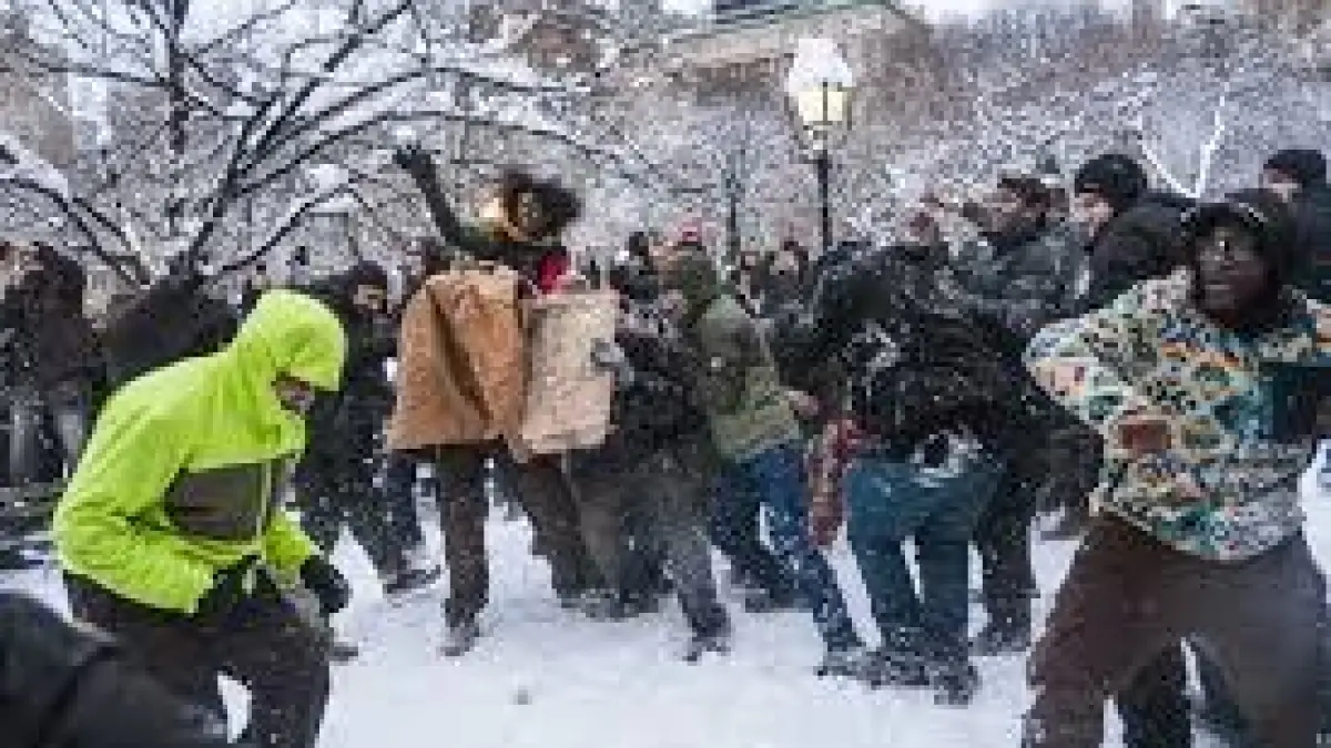 Officers were responding to a large snowball fight at Washington Square Park when footage shows snowballs striking two uniformed officers as they walked a park walkway. The officers pushed at least two people to the ground while snowballs continued to fly; the video also captures someone running up behind an officer and pressing snow onto the officer's head, and one officer rubbing his eye near the end of the clip.
