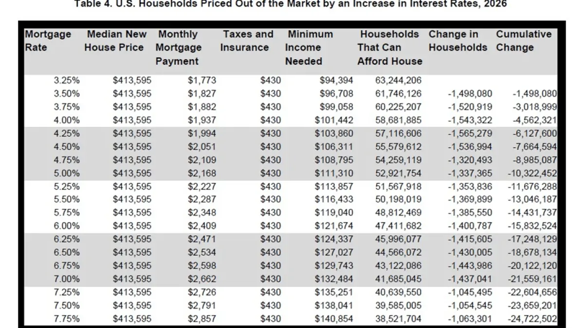 Estimates prepared for current market conditions show that at the start of 2026, with an average 30-year fixed rate near 6. 25%, about 31. 5 million households could afford a median-priced new home listed at $413, 595 under front-end underwriting standards that require a qualifying household income of $124, 336. A modest 25-basis-point decline from 6. 25% to 6. 00% would lower the qualifying income threshold enough to allow an estimated 1. 42 million additional households to afford that median-priced new home.