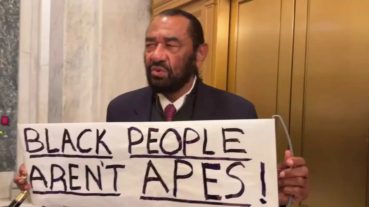 Separately, Rep. Al Green was ejected earlier from the House chamber for holding a sign that said "Black people aren't apes. " He was still holding the sign when he spoke to reporters in the Capitol on Feb. 25, 2026, telling them President Trump "got the message" on the sign.