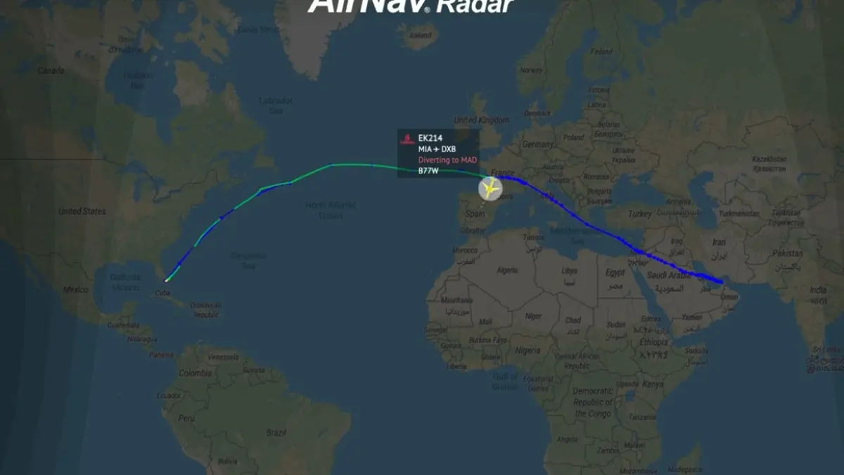 An Emirates Boeing 777-300ER operating as EK214 declared a general emergency and diverted to Madrid while en route from Miami to Dubai, a development picked up on flight tracker data as broader airspace disruptions after strikes on Iran prompted cancellations and airport suspensions across the Middle East.