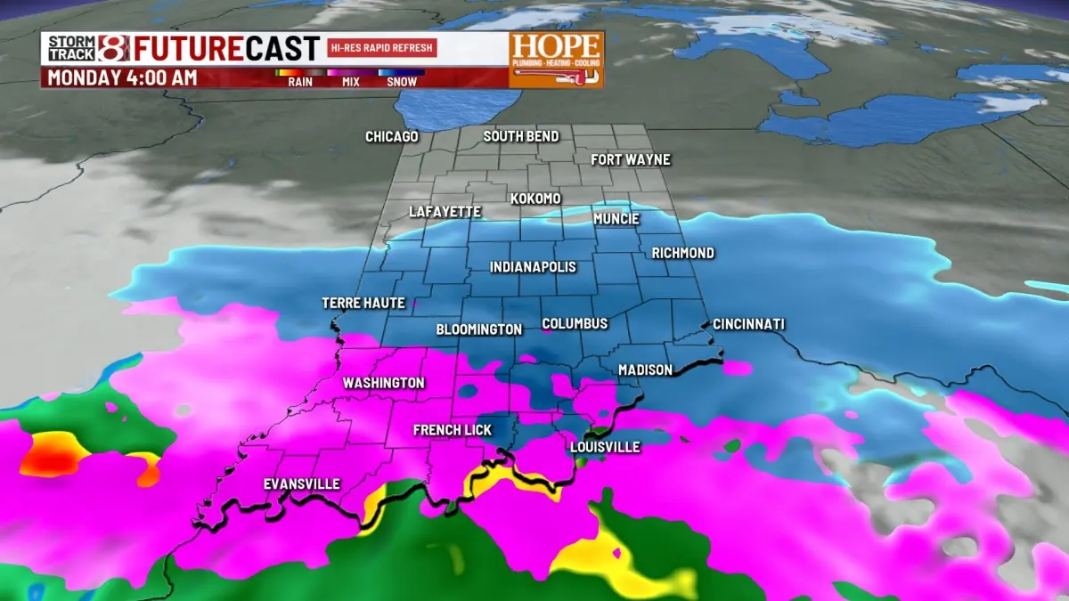 WISH-TV's forecast emphasizes the short window for wintry impacts on Monday followed by a more significant rainfall threat across central Indiana. Travel disruptions are most likely during Monday's morning commute due to sleet and minor snow accumulations. Through the rest of the week, residents should monitor daily precipitation chances and be aware that thunderstorm potential rises as temperatures climb toward the end of the period.