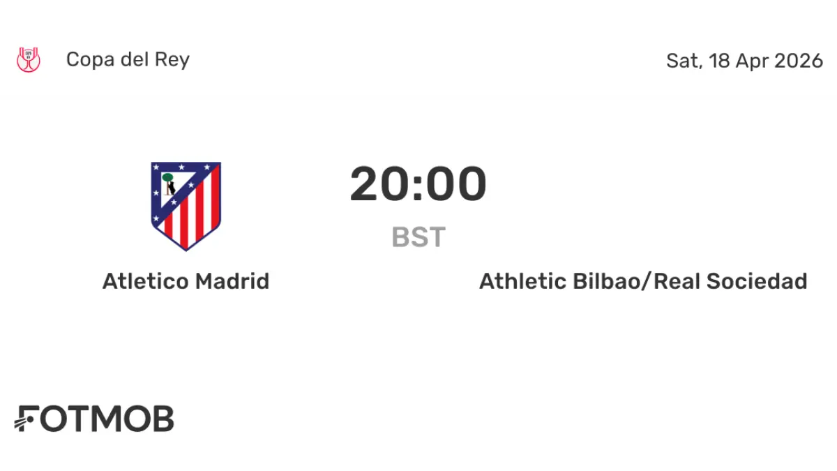 On the wider Copa del Rey calendar, Atletico Madrid is scheduled to face Athletic Bilbao/Real Sociedad at Estadio de La Cartuja on Sat, Apr 18, 2026, 19: 00 UTC, a fixture already listed on the competition’s match calendar.