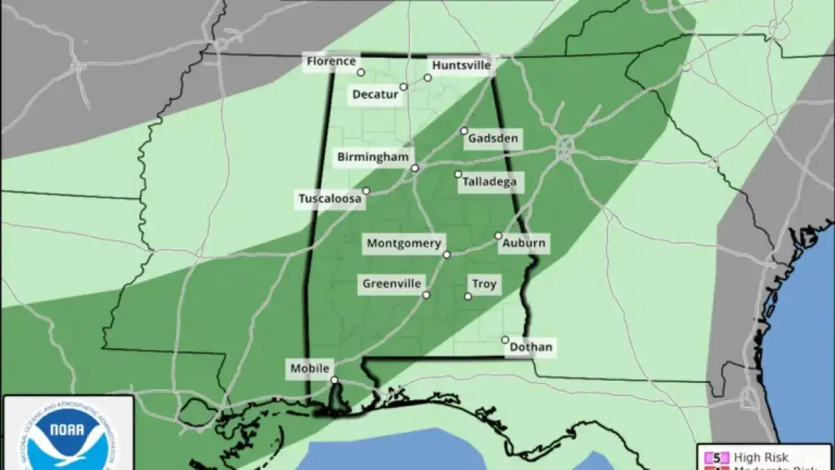 The Storm Prediction Center adjusted the severe weather risk for Alabama, lowering it to a Level 1 out of 5 for a significant portion of the state. This Level 1 designation indicates that isolated severe storms could develop.