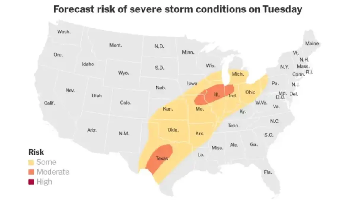 Severe weather systems are forecasted to hit a large swath of the United States this week, prompting warnings from meteorologists. The affected regions span from the southern Plains through the Midwest and into the Northeast, where conditions could lead to large hail, damaging winds, tornadoes, and flooding.