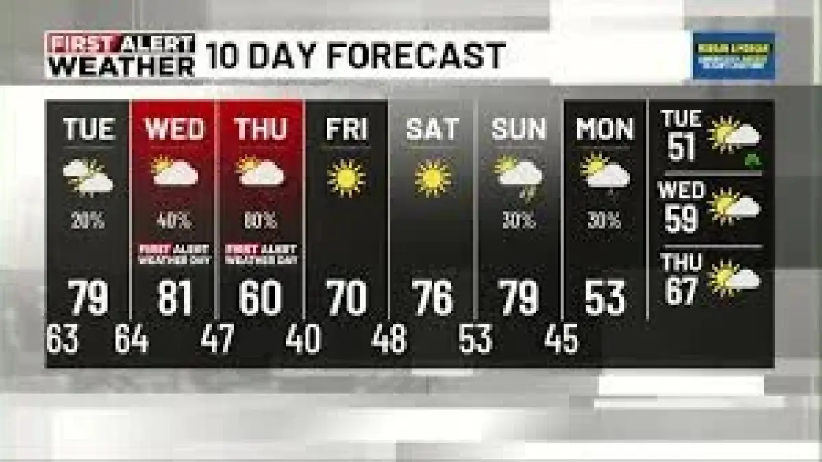 Conditions shift again late Wednesday into Thursday morning as the cold front arrives. Thursday starts with a chance of showers early, then gradually improves. Temperatures are expected to drop noticeably, with highs only reaching the low 60s as cooler air moves in behind the front—after warmer readings ahead of the system. The cool-down is expected to be brief: Friday clears with sunny skies and highs in the low 70s, with warming continuing into the weekend into the upper 70s. Early next week turns quieter with mostly sunny skies, highs in the 60s and 70s, and lows falling into the 40s and low 50s.