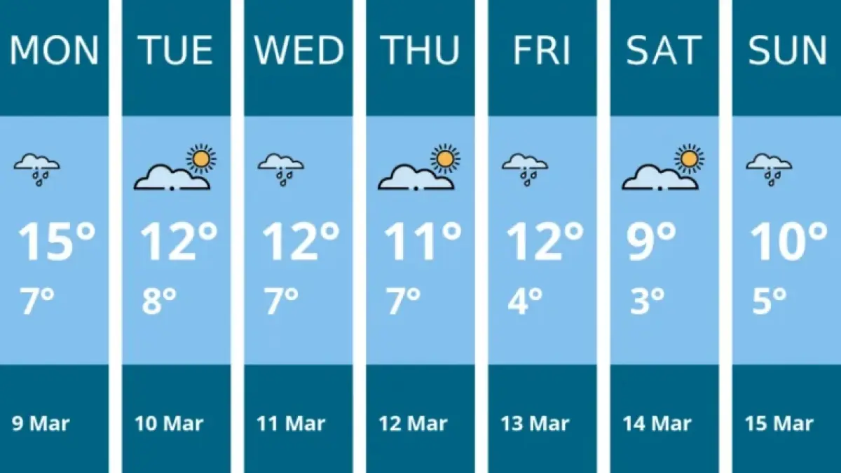 Expect monitoring of conditions through the week with attention on the inevitable midweek rain day and Thursday gusts that could affect travel. Commuters and outdoor planners should watch for changes and prepare waterproof clothing and contingency plans; the weekend trends toward drier conditions with Saturday the most favourable and Sunday carrying a moderate chance of later showers. The forecast for 9 Mar to 15 Mar frames short-term planning: early-week wet spells, midweek winds, then a cooler, mostly drier weekend.