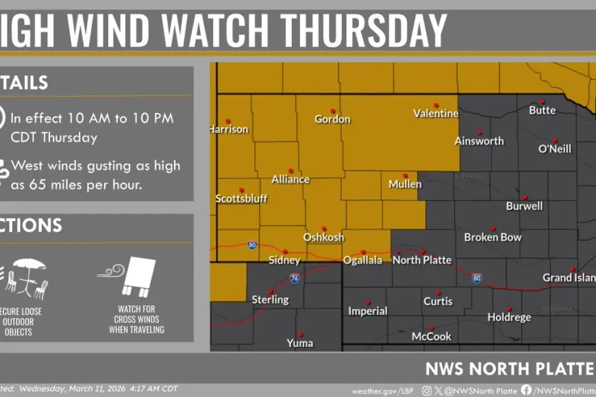 Officials there flagged risks to trucks, trailers, and RVs, and warned of possible damage to power lines, signs, and small outbuildings. Drivers operating large vehicles were advised to delay travel until winds subside Thursday evening.