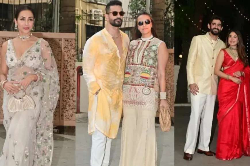 Shortly after the home ceremony, the couple made a public appearance that drew many well-known figures from film and sport. Celebrities named in coverage include Malaika Arora, Rhea Chakraborty, Anya Singh, Pooja Gor, Shahana Goswami, Masaba Gupta, Satyadeep Mishra, Zaheer Khan, Sagarika, Yuvraj Singh with wife Hazel Keech and their children, Soha Ali Khan, Neha Dhupia with Angad Bedi, Virender Sehwag and Farhan Akhtar. Reported outfit details from that public moment show distinct sartorial variety: Malaika Arora in a sheer ivory saree with pink and green floral embroidery; Rhea Chakraborty in a blush pink saree with white daisy embroidery and statement jhumkas; Anya Singh and Pooja Gor in white sarees with golden borders; Masaba Gupta in a golden patchwork ensemble; Zaheer Khan in a light grey Nehru jacket over a white kurta; Virender Sehwag in a blue kurta; Farhan Akhtar in a white kurta with subtle animal print motifs. Yuvraj Singh arrived with wife Hazel Keech and their kids, creating a family presence among the guests.