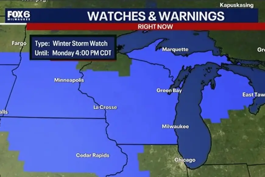 A winter storm watch is in effect for portions of Wisconsin from Saturday evening through Monday afternoon, covering east central, south central, and southeast parts of the state. Heavy snow, blowing snow, sleet, and freezing rain are all possible, with accumulating ice increasingly likely along and north of Interstate 94.