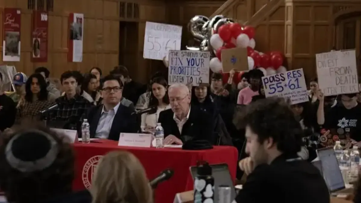 Student Assembly President Zora deRham ’27 repeatedly called for order. She warned that continued interruptions could lead to removal from the room.