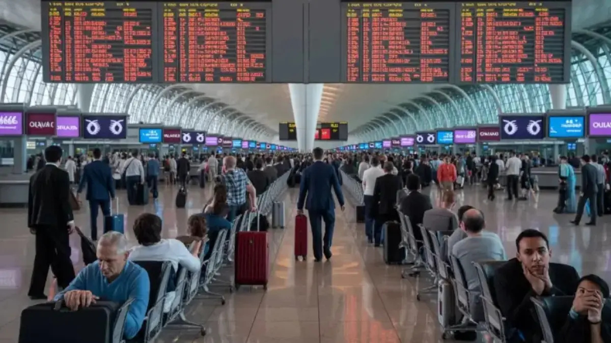 Travelers faced long lines at customer service desks and crowded gate areas. Many passengers sought rebooking help and accommodations during extended waits.