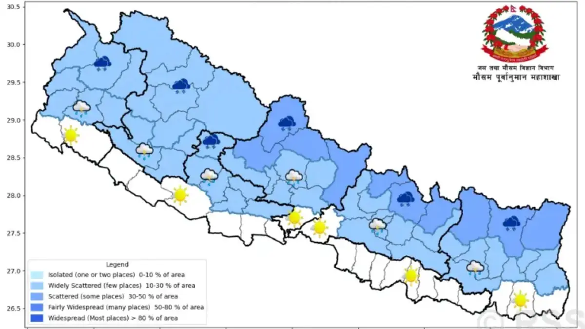 - Karnali: Continued cloudiness in mountains. Isolated thunderstorms and light snowfall possible.