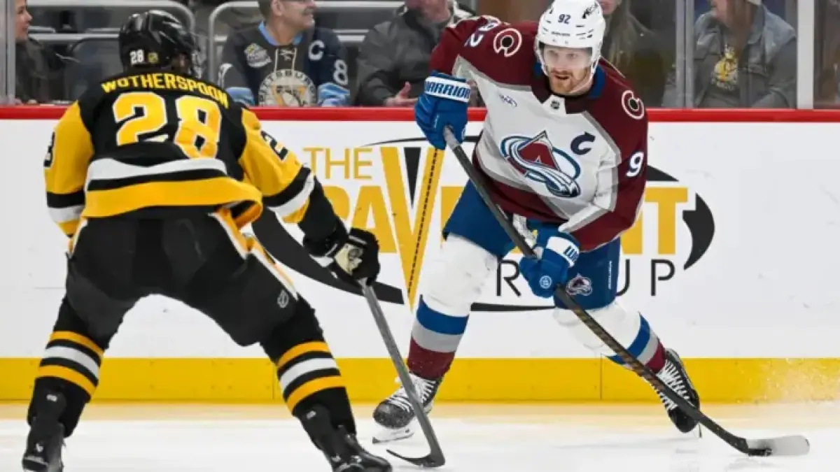 Gabriel Landeskog, wearing No. 92 for Colorado, carried the puck during the third period. He skated directly against Pittsburgh defenseman Parker Wotherspoon, No. 28. The image highlights the game’s intensity and physical matchups.