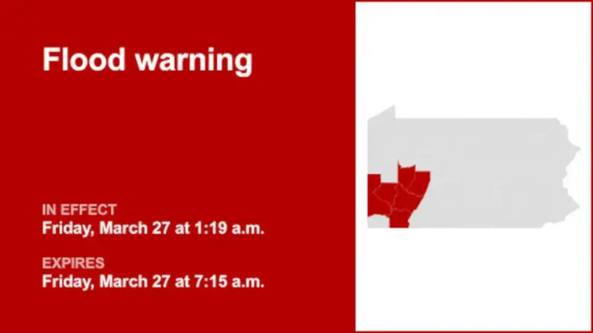 At 1:19 a.m. Friday the National Weather Service issued a flood warning. The alert covers Allegheny, Armstrong, Beaver, Fayette, Indiana, Washington and Westmoreland counties. It remains in effect until 7:15 a.m.