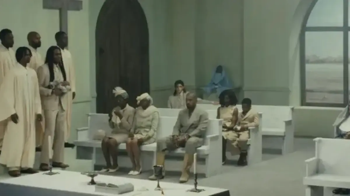 The video takes place inside a church. It stages what appears to be Travis Scott’s wedding to two women.