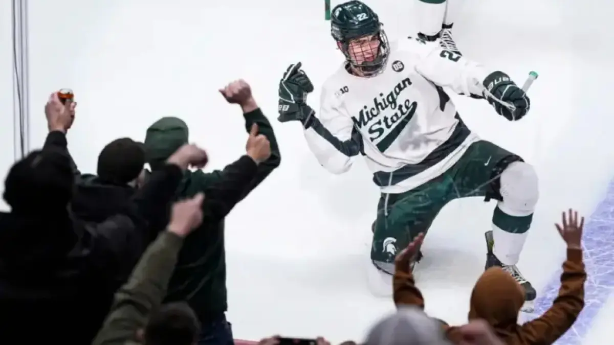 Michigan State forward Porter Martone saw his college season end in sudden fashion. His Spartans lost in overtime to the Wisconsin Badgers in the regional final. The defeat closed the door on a Frozen Four berth.