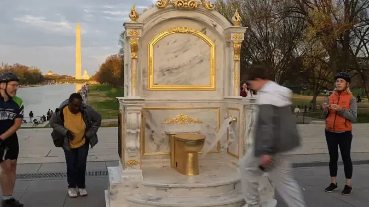 A golden toilet sculpture mounted on a marble throne appeared on the National Mall in Washington, D.C. The piece echoes styling associated with President Trump and protests the ongoing White House renovation.
