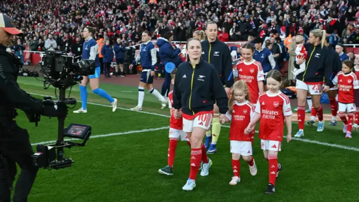 Arsenal captain Kim Little was caught off guard by a huge tifo at the Emirates Stadium. The display celebrated her 400th appearance for the club. More than 46,000 fans watched the north London derby on Saturday.