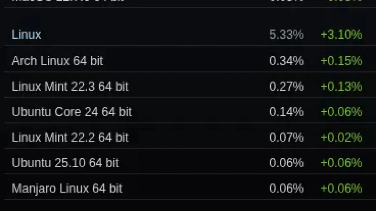 Steam on Linux rose to 5.33% in March 2026. That figure marks a 3.10 percentage-point increase from February.