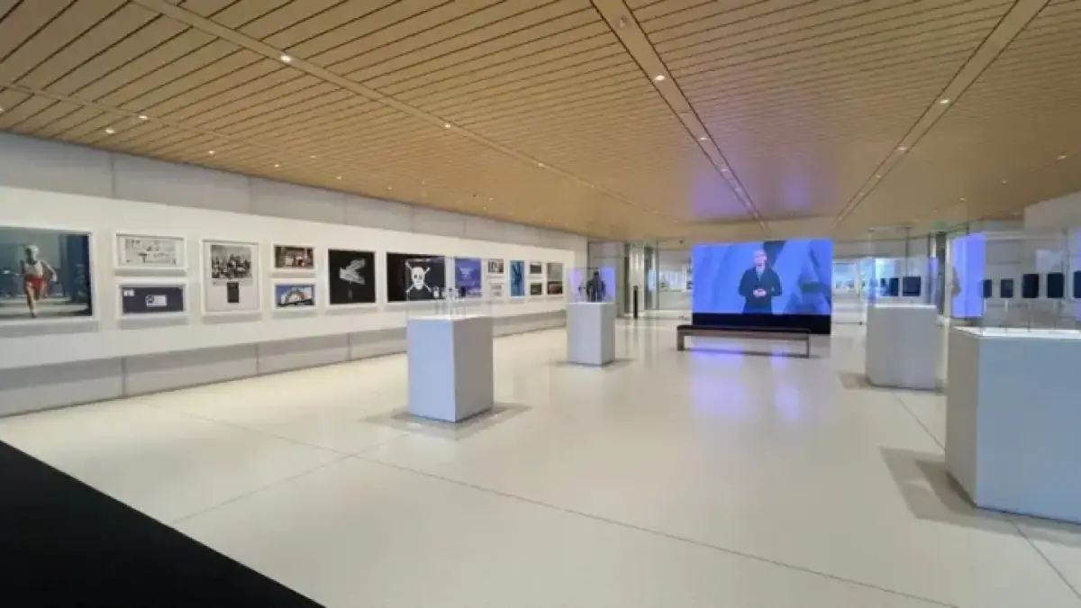 A standout element of the exhibit is a collection of prints showcasing students using Apple products, highlighting their importance in the educational landscape. Additionally, the exhibit features notable pop culture references, including images from Bad Bunny’s Super Bowl Halftime performance and award ceremonies for Apple TV.