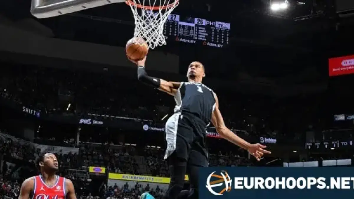The San Antonio Spurs beat the Philadelphia 76ers 115–102 Monday night at the Frost Bank Center. The victory was tempered by an injury to Victor Wembanyama late in the game.