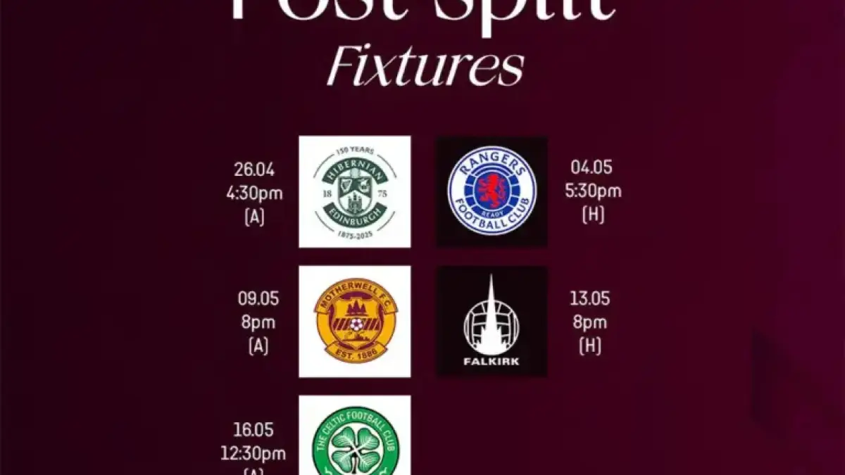 The confirmed post-split fixtures give clarity to Hearts’ end-of-season schedule. Supporters can plan travel and tickets now.