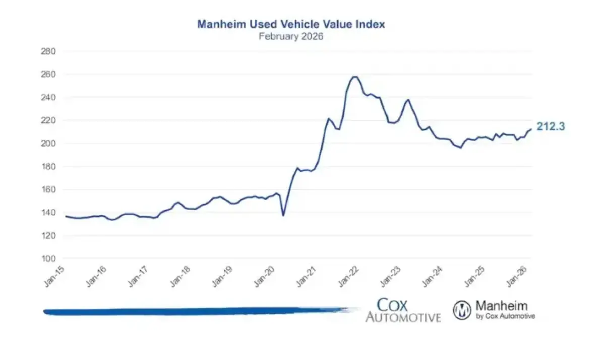 The Manheim Used Vehicle Value Index (MUVVI) climbed to 215.3 in March 2026. This reflects a 6.2% gain versus March 2025 and a 1.4% increase month over month. Non-adjusted wholesale used-vehicle prices rose 5.7% year over year and 4.2% versus February.