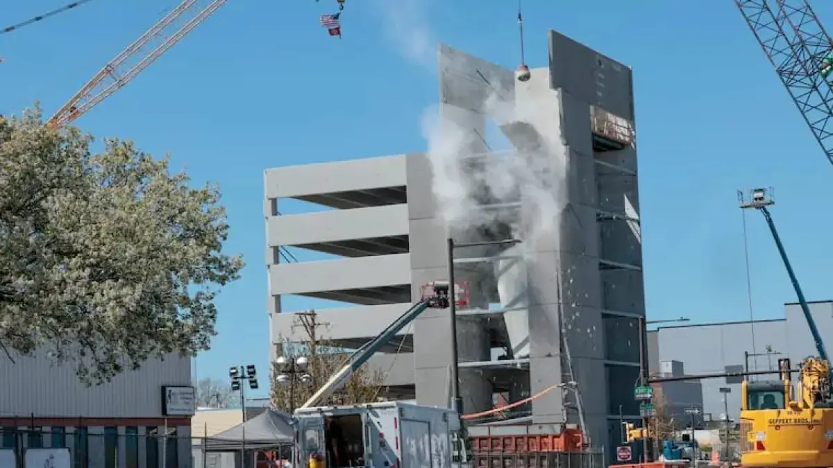 - Demolition began Saturday morning, with heavy machinery safely dismantling sections of the garage.