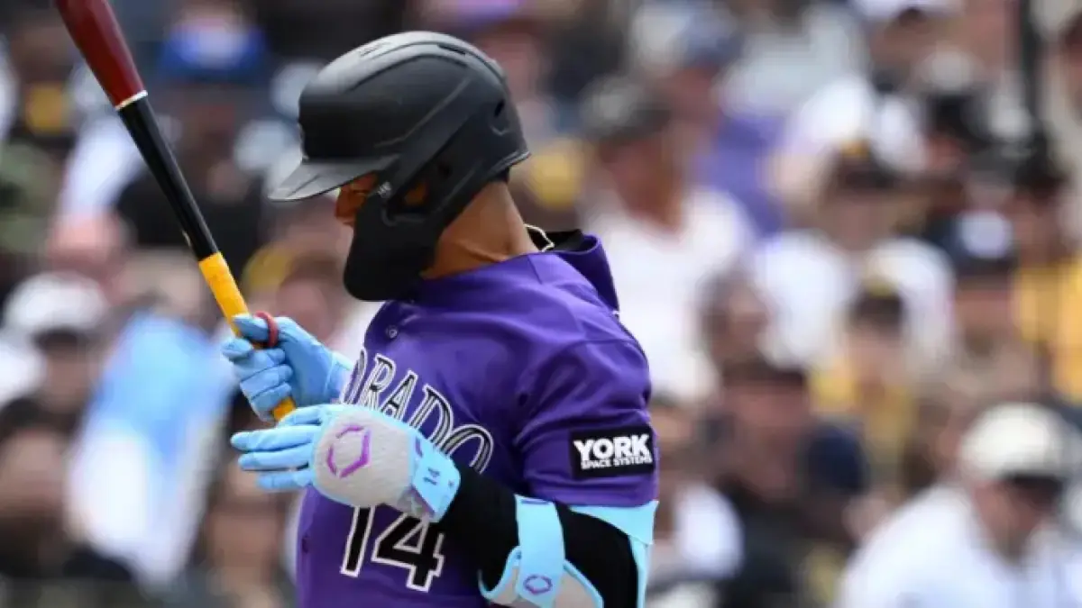 Ezequiel Tovar wears number 14 for the Rockies. He was struck by a pitch while at the plate in the fifth. The play drew attention from fans and photographers in attendance.