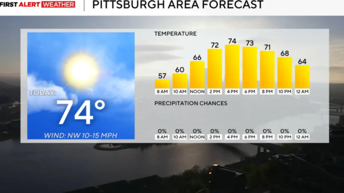 Forecast summary: Sunny Skies in Pittsburgh Today; Storms Expected Tomorrow. The day will be pleasant with abundant sunshine. Storm chances return to the region on Saturday.
